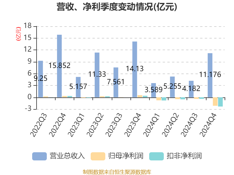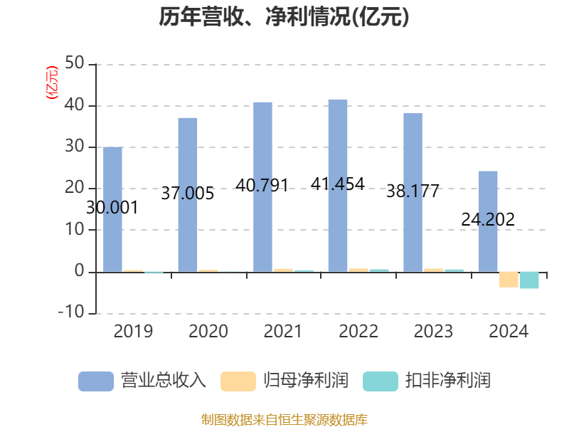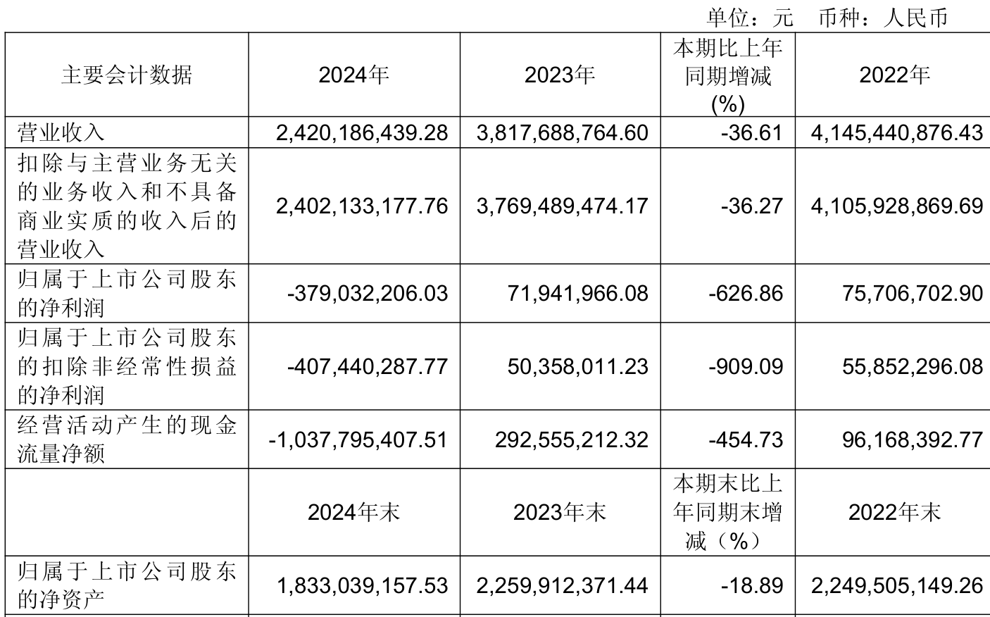 中证智能财讯航天晨光(600501)4月26日披露2024年年度报告。2024年,公司实现营业总收入24.20亿元,同比下降36.61%;归母净利润亏损3.79亿元,上年同期盈利7194.20万元;扣非净利润亏损4.07亿元,上年同期盈利5035.8万元;经营活动产生的现金流量净额为-10.38亿元,上年同期为2.93亿元;报告期内,航天晨光基本每股收益为-0.88元,加权平均净资产收益率为-18.52%。