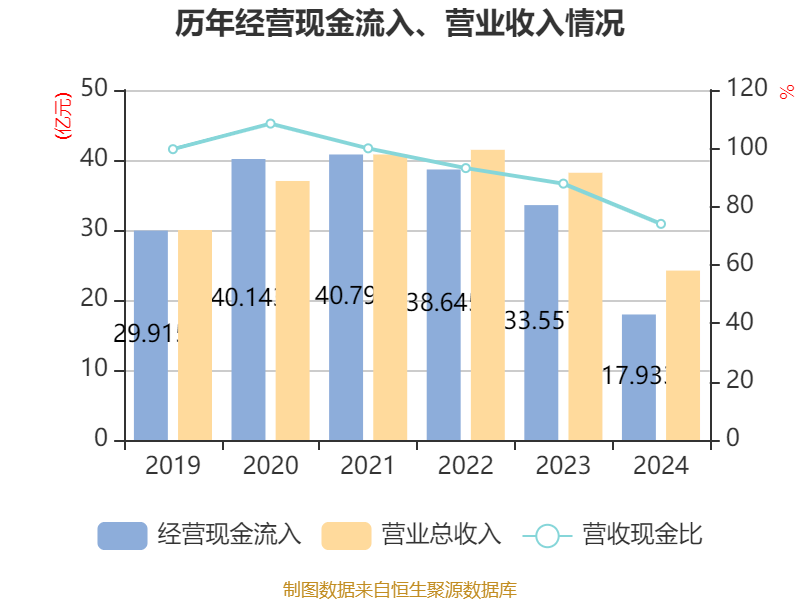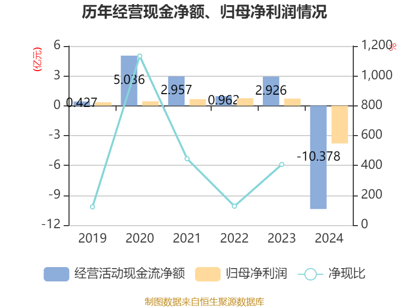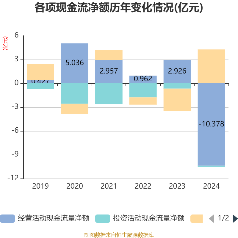 截至2024年,公司经营活动现金流净额为-10.38亿元,同比减少13.3亿元;筹资活动现金流净额4.27亿元,同比增加7.08亿元;投资活动现金流净额-1528.25万元,上年同期为-6648.78万元。