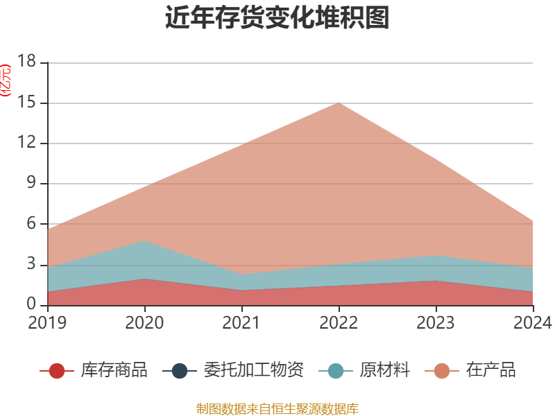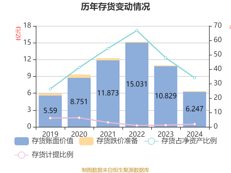 从存货变动来看,截至2024年末,公司存货账面价值为6.25亿元,占净资产的34.08%,较上年末减少4.58亿元。其中,存货跌价准备为1219.6万元,计提比例为1.91%。